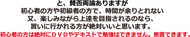 どちらも長所短所がありますが、初心者の方は習いに行かれる事をお勧めします。